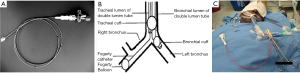 Meticulous planning needs to be done on the mode of securing the airway and its segments. In this regard the anaesthesiologist and the surgeon need to arrive on a consensus, keeping in mind the best interests of the patient. A DLT is the basic lung isolation modality worldwide. In our experience, one area that needs to be addressed in any infective pulmonary pathology is the need for selective lobar isolation on top of standard left from right lung isolation. Sometimes the cavitary lesions of tuberculosis with or without aspergiloma growth communicate with the adjacent bronchial lumen and thereby risking the spillage of its contents to the adjacent lobe and beyond (22). The risk increases further during intraoperative handling. So, along with a DLT which basically isolates the lung, further lobar isolation can be done with the help of bronchial blockers (Coopdech by Smith Medical, Rosmalen, NL, Arndt bronchial blocker by Cook Critical Care, Bloomington, USA) or Fogarty Arterial Embolectomy Catheters by Edwards Lifesciences (23). For example, if the infected cavity is in the left upper lobe, than we can advance the blocker to that lobar bronchus and isolate it from the left lower bronchus. Likewise, a diseased right upper lobe can be isolated by a blocker placed beyond the bronchus intermedius (Figure 9). We routinely resort to selective lobar isolation in suspicious cases. These blockers are removed after thorough suctioning once the surgeon takes the lobar bronchus in the stapler.