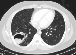 Pulmonary aspergillosis can manifest as invasive aspergillosis, allergic bronchopulmonary aspergillosis (ABPA) or cavitary pulmonary aspergillosis (Figures 4,5). In tuberculosis endemic countries of the world, the healed tubercular cavities act as the much needed nidus for saprophytic colonization of Aspergillus fumigatus. The fungal toxins erode the tissues and can cause haemoptysis when a vessel wall is eroded. Presence of the characteristic fungal ball with ‘air crescent’ in chest X-ray or CT scan clinches the diagnosis. Surgery in the form of pulmonary resection is the mainstay of treatment although intraoperative period can be complicated by dense intra-pleural adhesions, hemorrhage, air leak, disruption of cavity and seeding of the fungus with high morbidity (13-15). Surgical mortality ranges from 0% to 22.6% and reported recurrence rate is 5% (16).