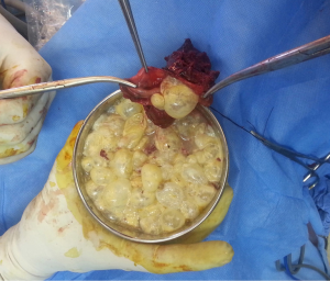 Hydatid disease is a caused by the larvae of Echinococcus. Clinical presentation of cystic echinococcosis (Figures 6,7) varies from asymptomatic disease to acute life threatening emergencies when cyst becomes infected or ruptures. Multiple organ systems may be involved including the brain, lungs, liver, peritoneum, bones, ovaries etc. (17-20). Surgery is the definitive method of treatment. Intraoperative leakage of cyst contents can lead to anaphylaxis and dissemination of infectious scolices causing pleural or bronchogenic hydatidosis. Scolicidal solutions like 1.5% cetrimide–0.15% chlorhexidine (10% Savlon), 3% hydrogen peroxide, 95% ethyl alcohol or 10% polyvinylpyrrolidone-iodine (Betadine) are routinely used along with intravenous steroid. Other non surgical techniques can be image guided percutaneous aspiration, infusion of scolicidal agents etc.