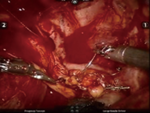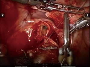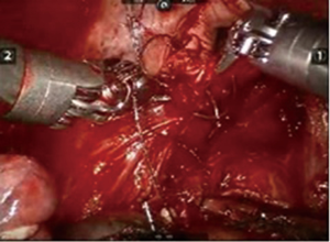 Some surgeons prefer three- or four-arm robot-assisted thoracoscopy with a utility incision, whereas others prefer complete portal robotic surgery (15,22). Insufflation with CO2 provides pneumothorax and sufficient exposure in the latter technique (23). We prefer the three-arm robot-assisted videothoracoscopically-based surgical technique, and the differences between the two techniques are described in a study of one of us (14). We use a bulldog prostate clamp to stabilize the first suture of a sleeve anastomosis, which makes the procedure easier and allows the operation time to be shorter.