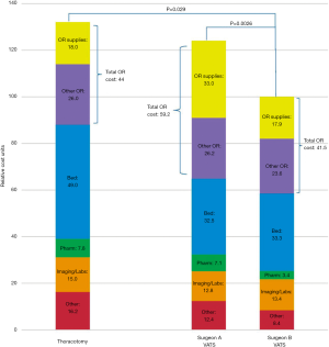 Other authors have focused on the higher intraoperative costs for VATSL vs. THORL, which has been proposed to neutralize or outweigh the cost savings that would derive from shorter length of stay with VATSL compared to THORL (23,24,27,29-31). Studies from 1993 to present have demonstrated longer operating room times for VATSL compared to THORL, with intraoperative costs making up a large portion of total VATSL hospitalization costs. For example, Deen and colleagues found that intraoperative costs were the largest category of expenses for VATSL (32). Likewise, Nakajima and colleagues found that intraoperative costs accounted for 63% of hospitalization costs for their entire cohort (29).