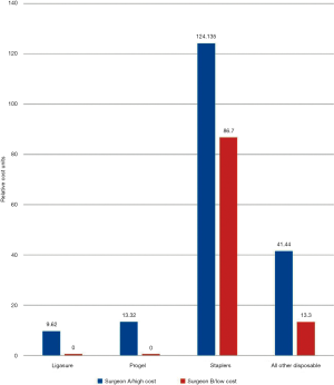 Our group recently published a study looking at costs of VATSL and THORL and the effect of intraoperative disposable instrument/device utilization on total cost (43). We found, comparing the costs incurred by two surgeons, that the increased costs of VATS lobectomy by one surgeon vs. those by a more cost-conscious surgeon resulted almost entirely from increased intraoperative costs (Figure 1). Further, the operating room cost of VATSL compared to THORL is also largely attributable to this surgeon-specific intraoperative device utilization (Figure 2). Within our institution, a cost-conscious surgeon who made it a policy to avoid expensive, disposable instruments had VATSL total hospitalization costs approximately 30% lower than THORL costs, while the less cost-conscious surgeon’s VATSL and THORL overall costs did not significantly differ. The overall hospital costs per case of VATSL for the more expensive surgeon were 24% higher than those for the less expensive surgeon. While the cost-conscious surgeon’s stapler costs were lower than the other surgeon’s, the difference in cost between the surgeons due to all other disposables (e.g., surgical sealants, energy devices, disposable ports) was more important than the effect of less staple load use. The cost-savings achieved intraoperatively during VATSL by the cost-conscious surgeon did not result in any difference in outcomes between the two surgeons.