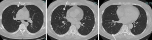 A retrospective study including 521 patients with colorectal cancer (CRC) lung metastases demonstrated only a moderate concordance between both CT scan (kappa index: 0.42) and fluorodeoxyglucose (FDG)-positron emission tomography (PET) (kappa index: 0.42) findings and the histologically proven number of metastases. Only 61.7% and 61.8% of histologically diagnosed metastases were correctly identified with the CT and FDG-PET scans, respectively (8). In a prospective trial, identification of lung metastases was compared between radiologists and a cloud cased computer-aided detection (CAD) system validated by experienced radiologists. From 225 patients, 75 had a total of 215 nodules. The sensitivity to detect lesions ≥3 mm was significantly higher using CAD (65% vs. 88%, P<0.01). Thus, the authors concluded that CAD-assisted reading improves nodules detection in patients with extrathoracic malignancies (9). Another recent prospective trial demonstrated that the use of CAD increased the sensitivity to detect lung metastases from 67.5% for all lesions (87.4% for metastases) to 77.9% (92.7% for metastases) (P<0.001). Nonetheless, 143 additional lesions (19 metastases) were detected during surgery (10). Park et al. (11) evaluated nodule detection of four readers who interpreted 1-mm sections of multidetector CT (MDCT), their detection rates increased from 91%, 88%, 87%, and 86% to 94%, 96%, 91%, and 92%, respectively, when the readers evaluated 5-mm maximum intensity projection (MIP) technique reconstructed at 1-mm intervals; the sensitivity change was significant for 3 of the 4 readers (11).