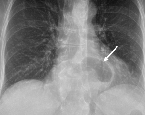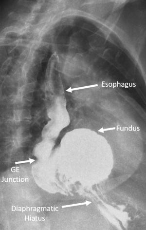 The main components of a diagnostic work-up and characterization of PEHs are a contrast swallow study and EGD. Chest X-rays may reveal a lucency in the retrocardiac space indicative of herniated stomach (see Figure 1) or pneumonia indicative of aspiration and these abnormalities are often the first clue to diagnosis. A chest X-ray alone, however, is not typically adequate in the work-up, as the differential diagnosis includes a mediastinal cyst, abscess, dilated/obstructed esophagus or other type of diaphragmatic hernia. CT scans of the chest and abdomen are helpful to understand the extent of herniation, accurately measure crural separation, and may be important in the acute setting. However, they are not always necessary in the elective setting, with contrast swallow studies and EGD being commonly used (12). Contrast swallow studies help classify the type of hernia by delineating the location of the GE junction and showing the extent of herniated stomach (see Figure 2). They can also help identify functional abnormalities of the esophagus, such as poor peristalsis or tertiary contractions, and may reveal reflux (either spontaneous or provoked).