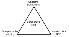 Obstruction can result when the stomach rotates around an axis along its mid-portion, resulting in a volvulus (6). Organoaxial rotation involves rotation of the stomach along the longitudinal axis on a line from the GE junction to the pylorus, leading to a closed-loop obstruction. A mesenteroaxial volvulus involves rotation along the transverse axis that bisects the greater and lesser curves. Mixed rotations along both axes can occur. Organoaxial is more common and typically presents with symptoms of retching with inability to vomit, epigastric pain and distention. Inability to pass a nasogastric tube in addition to these symptoms represents Borchardt’s triad (see Figure 3) and signifies a high-grade gastric obstruction (17). Gastric ischemia and resultant necrosis can occur with volvulus formation, if not corrected, and lead to perforation and subsequent mediastinitis, sepsis and death.